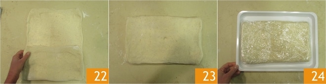 Donnez à la pâte le premier pli à 3 en ramenant vers le centre le bord inférieur 22 et en le recouvrant avec le bord supérieur 23. Couvrez le bloc obtenu avec du film plastique, transférez sur un plateau 24 et laissez reposer au réfrigérateur pendant 30 min.