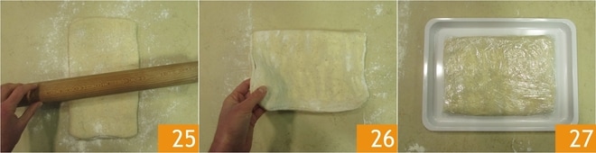 Étalez à nouveau la pâte sur le plan de travail légèrement fariné 25 (toujours jusqu'à obtenir un rectangle de 50x25 cm) et donnez le deuxième pli à 3, comme précédemment 26. Couvrez à nouveau le bloc avec du film plastique et laissez reposer encore pendant 30 min au réfrigérateur 27.
