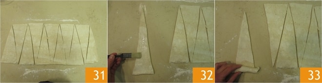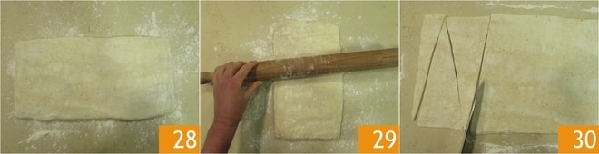 Après le repos au réfrigérateur, répétez l'opération en effectuant le troisième et dernier pli à 3 28. Couvrez à nouveau la pâte avec du film plastique et laissez reposer au réfrigérateur pendant 30 min. Puis reprenez-le et étalez-le sur le plan de travail fariné 29 pour obtenir, cette fois, un rectangle de 60x25 cm. Avec un couteau bien aiguisé, réalisez des triangles avec une base de 10 cm 30.