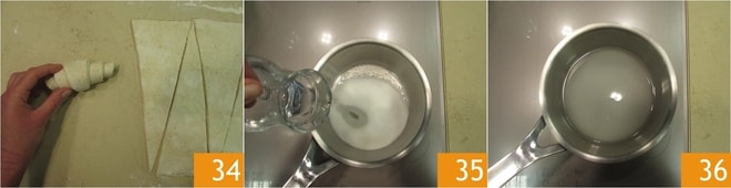 de manière à ce que la partie de la fermeture se termine en bas 34. Transférez sur une plaque et laissez-les lever pendant 2 heures à une température d'environ 25°C. Pendant ce temps, réalisez le sirop : versez dans une casserole l'eau et le sucre 35, portez à ébullition pendant quelques minutes 36. Puis, éteignez le feu et laissez refroidir.