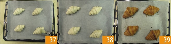Après le temps de levée, badigeonnez délicatement la surface des croissants avec le sirop obtenu 37 38. Faites cuire dans un four statique préchauffé à 190°C pendant 25 minutes. Retirez et laissez refroidir avant de servir 39 !