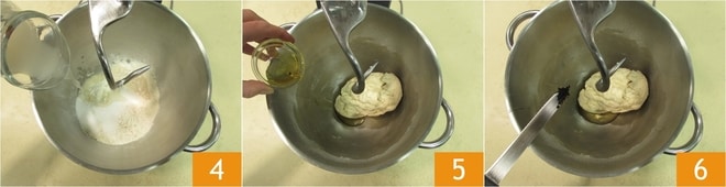 et l'eau dans laquelle vous aurez dissous la levure 4. Activez la machine et travaillez jusqu'à obtenir une pâte élastique. Ajoutez ensuite l'huile de riz 4, les graines de la gousse de vanille 5.