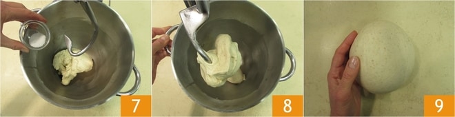Enfin, le sel 7. Travaillez tous les ingrédients avec le crochet jusqu'à obtenir une pâte lisse, homogène et bien liée 8. Transférez la pâte obtenue sur le plan de travail et façonnez-la rapidement en boule pour obtenir une forme sphérique 9.