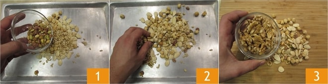Pour préparer le croquant, commencez par griller les fruits secs : placez sur une plaque de cuisson les pignons, les pistaches, les amandes et les noisettes 1, répartissez-les sur la plaque 2 et faites-les griller dans un four statique préchauffé à 180° pendant 5 minutes. Une fois grillés, placez les fruits secs sur une planche à découper et ajoutez également les cerneaux de noix 3.