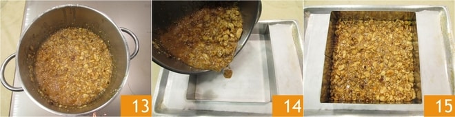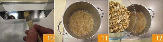 Huilez le bord intérieur du moule 10. Pendant ce temps, le sirop sera devenu de couleur ambrée et des bulles apparaîtront à la surface 11. À ce stade, ajoutez les fruits secs 12.
