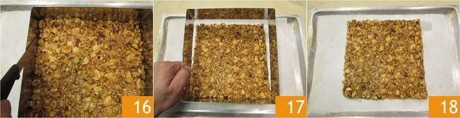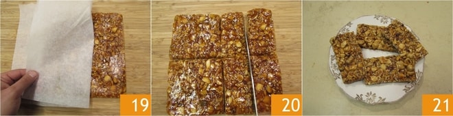Retournez le croquant sur une planche à découper, retirez le papier sulfurisé 19 et coupez-le en 8 morceaux égaux 20. Laissez reposer jusqu'à ce que les barres soient complètement compactes et dures. Vous pouvez ensuite transférer le croquant sur un plat de service 21 !
