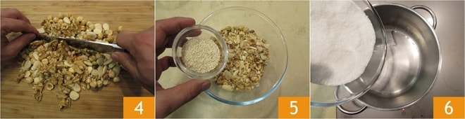 Hachez le tout grossièrement avec un couteau 4. Versez les morceaux dans un bol, ajoutez les graines de sésame 5 et mélangez. Occupez-vous maintenant du caramel : dans une casserole, versez l'eau et le sucre 6.
