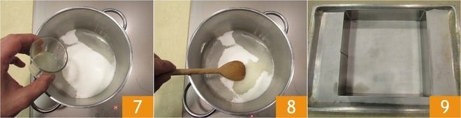 Ajoutez également le jus de citron 7, mélangez avec une cuillère 8 et faites fondre jusqu'à ce que le sirop atteigne la température de 140°. Prenez un moule carré sans fond de 20x20 cm et placez-le sur une plaque recouverte de papier sulfurisé 9.