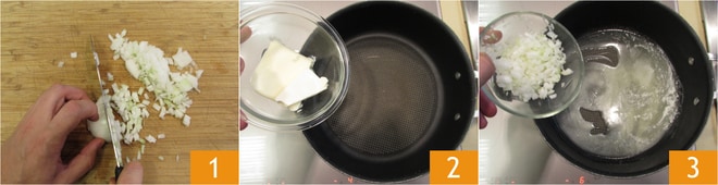 Pour préparer les croquettes de jambon, hachez finement un oignon 1. Faites fondre le beurre dans une casserole 2 et faites mijoter l'oignon pendant 10 minutes à feu moyen-doux 3.