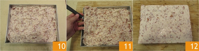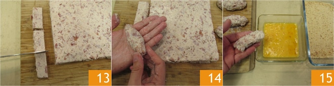Avec un couteau, découpez 10 rectangles égaux 13. Donnez-leur la forme d'une croquette en les façonnant avec vos mains humides. Passez les croquettes d'abord dans les œufs battus 15