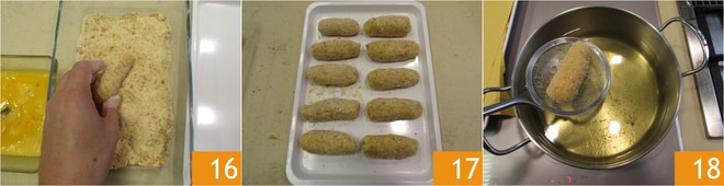 puis dans la chapelure 16. Au fur et à mesure que vous les panez, déposez-les sur un plateau 17. Chauffez l'huile de graines et amenez-la à 170°C. Faites cuire les croquettes pendant 3 minutes, 2 à la fois maximum 18.