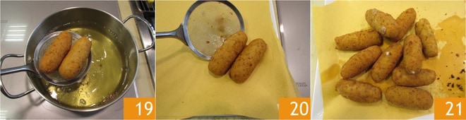 Égouttez-les lorsqu'elles sont dorées 19 et laissez-les sécher sur du papier absorbant 20. Servez les croquettes de jambon immédiatement 21.