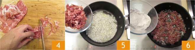 Entre-temps, coupez le jambon en lanières 4, ajoutez-le dans la poêle 5 et faites-le cuire 1 minute. Ajoutez la farine d'un seul coup 6, faites-la griller pendant 2 minutes.