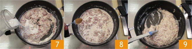 Versez le lait en 3 fois 7 et parfumez avec la muscade 8. Il faut obtenir une sorte de béchamel très épaisse, il faudra environ 6 minutes 9.
