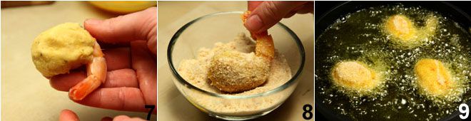 Divisez le mélange en 15 boules avec lesquelles, en les aplatissant, vous couvrirez les crevettes 7, formant des croquettes en laissant visible la queue de la crevette. Passez les croquettes dans l'œuf battu puis dans la chapelure 8, ensuite faites-les frire dans l'huile chaude 9 (180-200° maximum) et égouttez-les sur une assiette recouverte de papier absorbant. Si vous préférez, vous pouvez choisir de cuire les croquettes de pois chiches et crevettes au four, en réglant la température du four à 200 degrés et en les laissant cuire environ 15 minutes ou jusqu'à ce qu'elles soient dorées. Servez les croquettes de pois chiches et crevettes encore chaudes, accompagnées, si vous le souhaitez, de quelques sauces comme la mayonnaise, la sauce soja, ou la sauce cocktail.