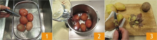 Pour préparer les croquettes de pommes de terre, lavez les pommes de terre sous l'eau courante 1 et faites-les cuire 2 avec la peau dans de l'eau salée : pour obtenir une cuisson uniforme, utilisez des pommes de terre de la même taille autant que possible. Une fois cuites (pour des pommes de terre de taille moyenne, il faudra 15-20 minutes en cocotte-minute et environ 40 en les cuisant traditionnellement), laissez-les légèrement refroidir (juste ce qu'il faut pour pouvoir les manipuler) puis épluchez-les 3 en les piquant avec une fourchette et en enlevant la peau avec un petit couteau.