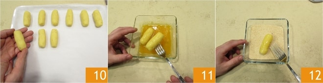 Au fur et à mesure que vous formez les croquettes, posez-les sur un plateau recouvert de papier sulfurisé 10. Avec la dose indiquée, vous obtiendrez environ 30 croquettes. Une fois la pâte terminée, panez les croquettes : préparez deux bols avec respectivement les deux œufs battus et la chapelure, maintenant passez-les d'abord dans l'œuf 11 puis dans la chapelure 12