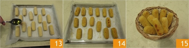 Disposez les croquettes panées sur une plaque recouverte de papier sulfurisé, arrosez-les d'un filet d'huile d'olive 13. Placez les croquettes au réfrigérateur pendant 15 minutes pour qu'elles conservent leur forme pendant la cuisson et faites cuire les croquettes dans un four statique préchauffé à 200° pendant 10 minutes, puis poursuivez la cuisson pendant encore 5 minutes avec le grill. Une fois la cuisson terminée, sortez vos croquettes de pommes de terre du four 14, laissez-les légèrement refroidir puis servez-les bien chaudes 15 !