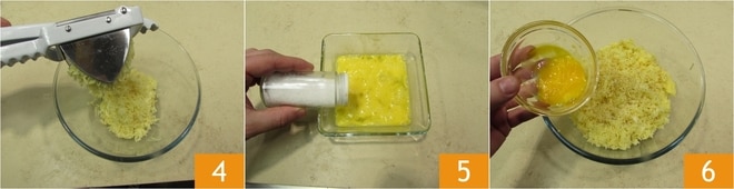 Passez-les dans un presse-purée 4 encore chaudes et recueillez la purée dans un bol, à part, battez les jaunes d'œufs avec du poivre et du sel 5 (considérez que 30 g de jaunes correspondent aux jaunes de 2 œufs moyens) puis ajoutez-les aux pommes de terre 6