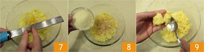 aromatisez avec de la muscade râpée 7 et assaisonnez avec le fromage râpé 8, mélangez avec une cuillère pour amalgamer les ingrédients jusqu'à obtenir une pâte douce et sèche. Avec l'aide d'une cuillère, prenez une portion de pâte d'environ 35 g 9 et formez les croquettes en leur donnant une forme cylindrique.