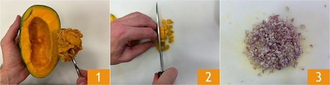 Pour préparer les croquettes de riz avec citrouille et stracchino, commencez par enlever les graines et la peau de la citrouille 1, puis coupez-la en dés de un demi-cm 2. Préparez et hachez l'échalote 3.