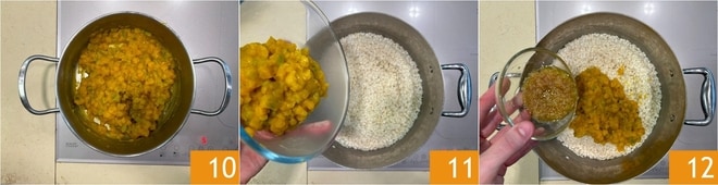 Lorsque la citrouille est tendre 10, versez-la dans le riz cuit et égoutté 11, puis ajoutez l'échalote 12 et parfumez avec la marjolaine.