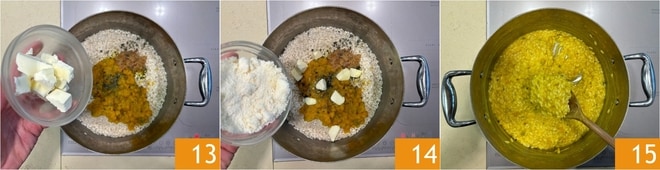 Mélangez avec du beurre 13 et du Parmigiano Reggiano DOP râpé 14. Mélangez pour bien amalgamer le tout 15.