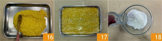 Étalez le riz sur une large plaque 16 et laissez refroidir, puis couvrez avec du film plastique 17 et transférez au réfrigérateur pour raffermir pendant environ une heure. Préparez maintenant la pâte : dans un bol, versez la farine et l'eau 18.