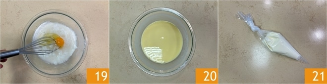 Ajoutez une pincée de sel et l'œuf, puis mélangez avec un fouet 19 pour obtenir une pâte lisse et sans grumeaux 20. Transférez le stracchino dans une poche à douille 21.