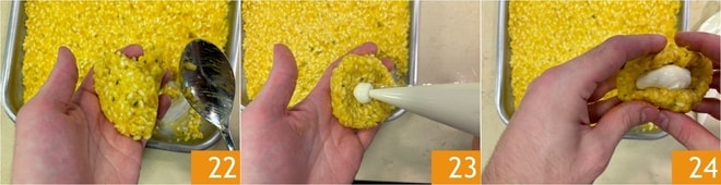 Récupérez le riz du réfrigérateur, prélevez une cuillère 22, aplatissez-le pour former un disque et pressez au centre un peu de stracchino 23. Refermez le disque en enveloppant le fromage avec le riz 24.