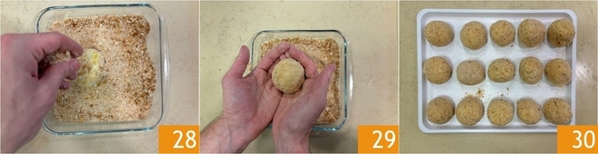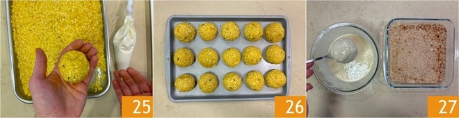 Donnez une forme sphérique 25 et placez sur un plateau 26. Continuez de cette manière jusqu'à épuisement des ingrédients. Maintenant, plongez les croquettes dans la pâte 27.