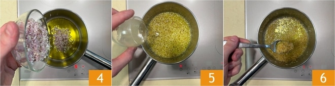 Chauffez un peu d'huile d'olive dans une casserole, versez l'échalote hachée 4 et faites-la revenir dans l'huile pendant environ 10 minutes à feu moyen-doux. À ce stade, déglacez avec le vin blanc 5, laissez évaporer l'alcool et faites cuire à feu doux pendant 5 minutes. Une fois prêt, mettez le soffritto de côté 6.