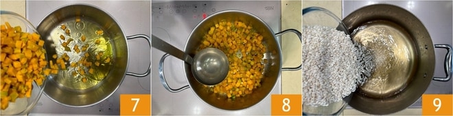 Dans une casserole, chauffez un autre filet d'huile, ajoutez les dés de citrouille 7 et faites-les revenir brièvement, puis salez, poivrez et faites cuire pendant 15 minutes en ajoutant environ 200 g de bouillon de légumes 8. Entre-temps, faites bouillir le riz dans 700 g de bouillon de légumes pendant 12 minutes 9.