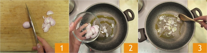 Pour préparer les croquettes de riz aux 4 fromages, commencez par préparer le bouillon de légumes en suivant notre recette et gardez-le au chaud. Passez au risotto. Hachez finement l'échalote 1, puis mettez-la dans une grande casserole avec un filet d'huile 2. Faites mijoter à feu doux pendant environ 4-5 minutes 3.
