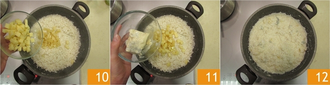 Ajoutez également l'Emmentaler 10 et le gorgonzola 11 et mélangez bien pour fondre le riz jusqu'à ce que tous les fromages soient fondus 12.