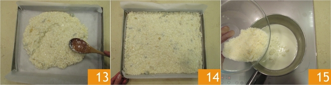 Transférez le riz sur une plaque recouverte de papier sulfurisé 13 et nivelez-le 14. Couvrez avec du film plastique et laissez refroidir au réfrigérateur. Maintenant, occupez-vous de la farce. Dans une petite casserole, versez la crème et chauffez-la. Ajoutez le Grana Padano DOP râpé 15 et mélangez.