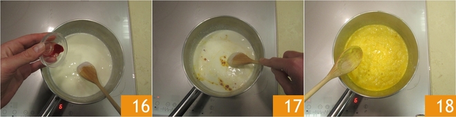Ajoutez également le safran 16 et mélangez pour le faire fondre complètement 17. Laissez cuire à feu doux pendant environ 5-6 minutes jusqu'à ce qu'il ait épaissi 18.