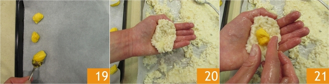 Laissez refroidir pendant environ 15 minutes, puis avec une cuillère, formez 12 petites boules à l'aide de 2 cuillères à café et transférez-les au fur et à mesure sur une plaque avec du papier sulfurisé 19. Quand le riz est froid, prenez-en une petite portion et étalez-la dans le creux de votre main 20. Placez une boule de farce au centre 21.