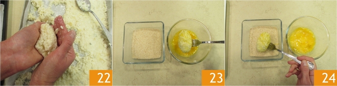 Repliez maintenant le riz de manière à recouvrir la farce 22 et donnez la forme typique de la croquette. Procédez de cette manière pour former toutes les croquettes, avec ces doses vous en obtiendrez 12. Passez à la panure. Battez les œufs avec un peu de poivre. Passez les croquettes, une à une, d'abord dans l'œuf 23 puis dans la chapelure 24.