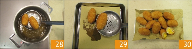 Elles doivent être bien panées de tous les côtés 25. Continuez de cette façon pour paner toutes les croquettes et placez-les au fur et à mesure sur un plateau 26. Chauffez l'huile dans une grande casserole jusqu'à une température de 170°C. Plongez quelques pièces à la fois 27, afin de ne pas faire trop baisser la température.