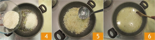 Maintenant, versez le riz dans la casserole 4 et faites-le griller pendant quelques minutes. Faites cuire le riz en ajoutant petit à petit le bouillon chaud 5. Attendez toujours que le liquide soit absorbé avant d'ajouter la louche suivante de bouillon 6.