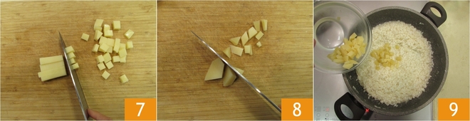 Entre-temps, coupez l'Emmentaler 7 et le provolone 8 en cubes. Une fois que le riz est cuit, rectifiez l'assaisonnement en sel et éteignez le feu, puis ajoutez les cubes de provolone 9.
