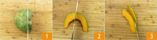 Pour préparer le Crostone avec potiron grillé et robiola, commencez par le potiron : coupez-le en tranches d'environ 0,5 cm 1 et retirez-en les graines, coupez les tranches en deux 2 et retirez la peau 3.