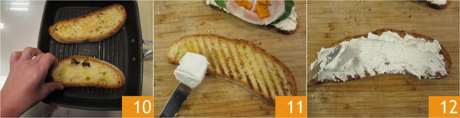 Toastez aussi le pain sur la grille jusqu'à ce qu'il soit bien doré 10. Commencez la composition du crostone : étalez une couche de robiola d'environ 45 gr 11 sur chaque tranche 12.