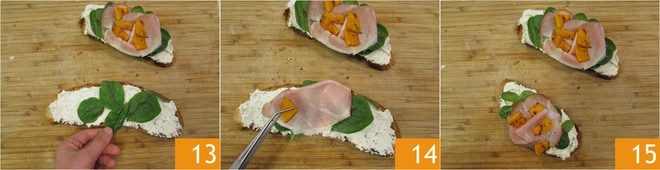 Garnissez ensuite avec des pousses d'épinard 13, jambon de Prague et potiron grillé 14. Le Crostone avec potiron grillé et robiola est prêt à être dégusté 15.