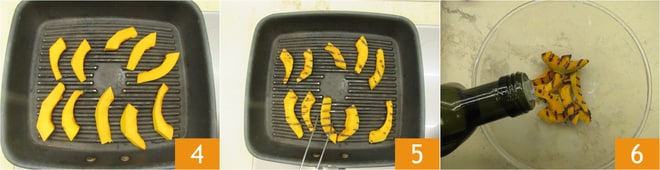 Grillez les tranches de potiron des deux côtés sur une grille chaude 4 jusqu'à ce qu'elles soient bien cuites 5. Transférez le potiron dans un bol et assaisonnez-le avec de l'huile 6,