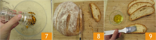 poivre et sel 7, mettez-le de côté. Coupez le pain en tranches 8 et badigeonnez-le d'huile d'olive 9.