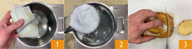 Pour préparer les crostini avec brandade de morue, commencez par mettre la morue dans une casserole avec de l'eau froide 1 et portez à ébullition. Faites cuire pendant 15 à 20 minutes, ou jusqu'à ce que la morue soit tendre, en éliminant l'écume qui se formera à la surface 2. Pendant ce temps, coupez le pain en tranches 3.