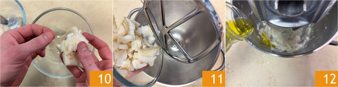 Retirez également les arêtes 10 et émiettez-la avec les mains. Transférez la morue dans un robot culinaire muni d'une feuille 11, actionnez et ajoutez l'huile d'olive en filet 12 ; vous devez obtenir une consistance crémeuse. Si c'est trop sec, vous pouvez ajouter un peu d'eau de cuisson de la morue petit à petit jusqu'à obtenir la consistance désirée.