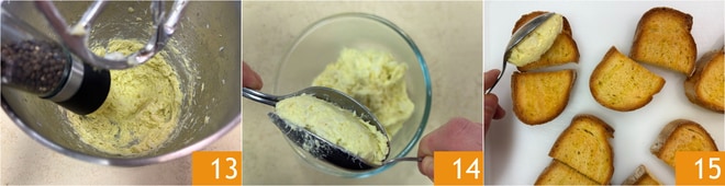 Ajustez le sel et le poivre 13. Formez des quenelles à l'aide de 2 cuillères 14 et posez-les sur les crostini 15.